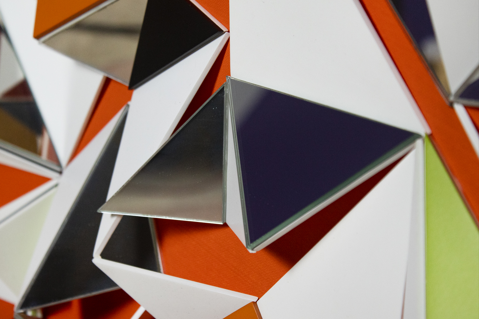 «Entre el Reflejo», despliega un juego geométrico a través de triángulos cuidadosamente dispuestos, cuya inclinación y ubicación trazan una narrativa visual de movimiento y descubrimiento. Cada línea que se genera a partir de la disposición de los triángulos guía al espectador por el espacio de la obra, abriendo caminos que dirigen la mirada hacia nuevas perspectivas. Este recorrido no es lineal, sino una invitación a explorar la interacción entre forma y vacío, desafiándonos a contemplar la relación entre lo geométrico y lo subjetivo. A medida que avanzamos por la pieza, nos enfrentamos a la ausencia de elementos, lo que nos lleva a construir imágenes en nuestra mente a partir del vacío.