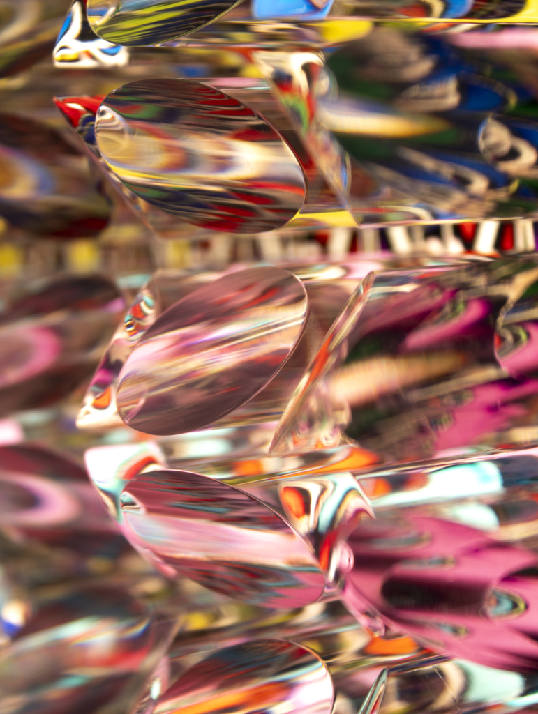 Espectro onírico es una alucinación visual en la que las imágenes se mezclan y entrelazan contundiéndose con la realidad. Esta obra refleja la riqueza del mundo de los sueños y representa un amplio rango de experiencias visuales y emocionales. Mezclando técnicas de impresión digital y luz, con la transparencia y el volumen del plexiglass la obra nos proporciona fantásticas imágenes, caleidoscopios de colores vibrantes, formas abstractas, volúmenes y perspectivas ocultas que invitan a la imaginación y a la contemplación de una realidad de múltiples posibilidades. A medida que el espectador cambia de posición, rodea la pieza, se aleja o se acerca, la contempla de arriba y de abajo o de un lado a otro, la obra cambia, las figuras mutan y los colores se mezclan ofreciendo imágenes que hipnotizan.
