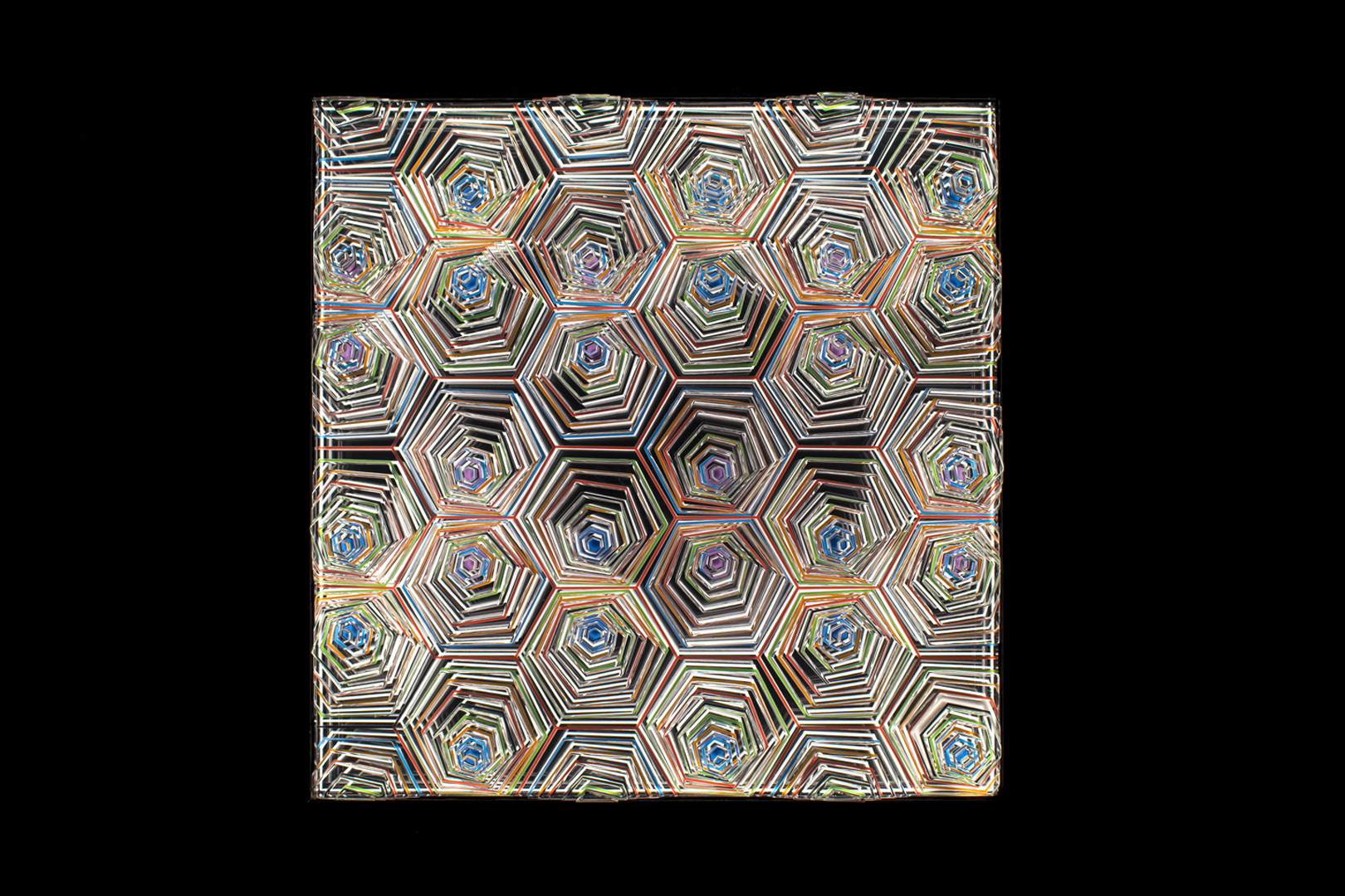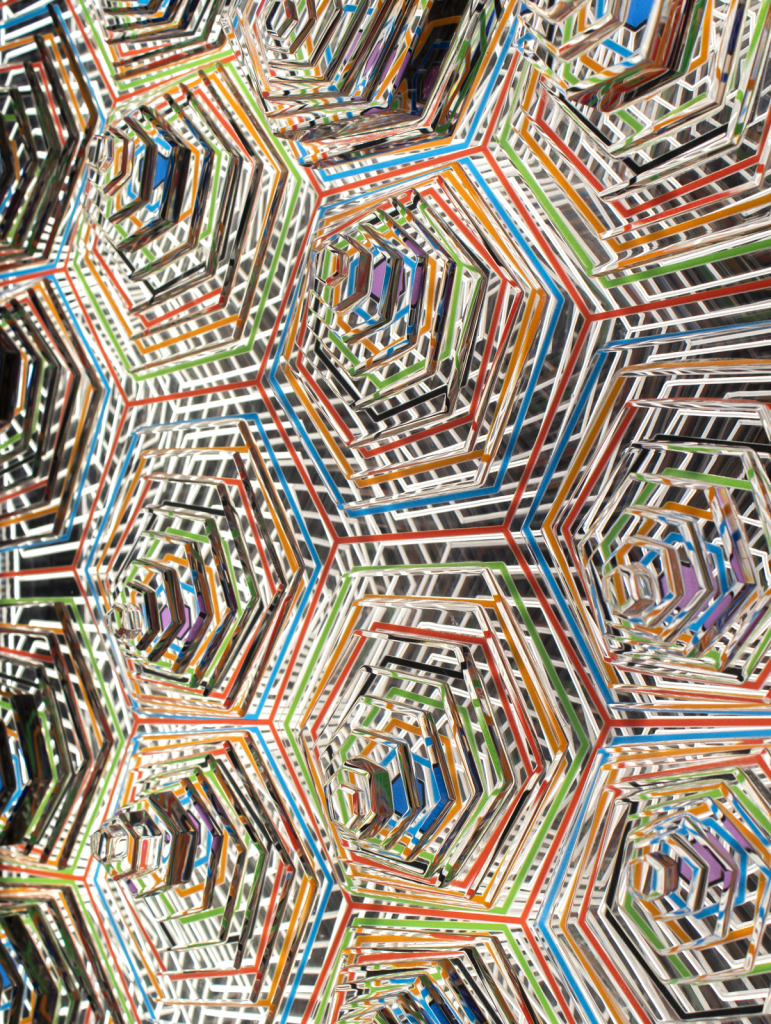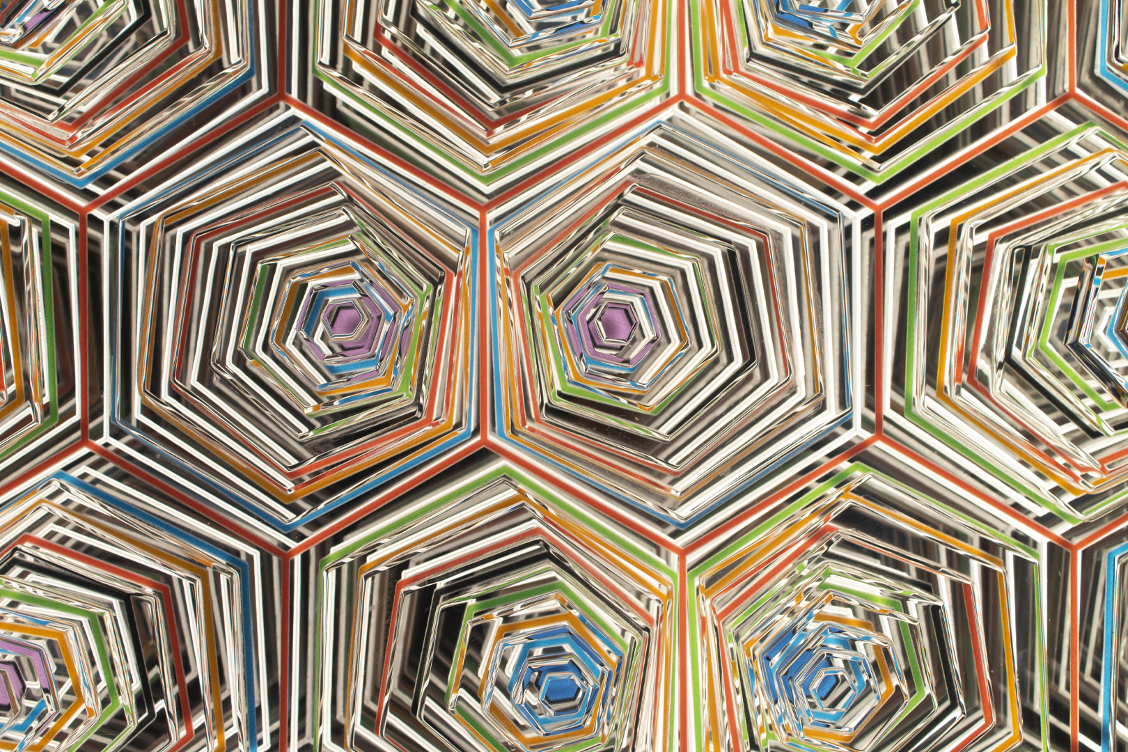 «Espejismo Hexagonal» es más que una obra de arte estática; es una experiencia envolvente que juega con los planos de percepción, desafiando las nociones convencionales de observación y creando un diálogo visual entre la obra y su espectador. Esta obra se despliega en un patrón de hexágonos que, al igual que un espejismo, se reconfigura y transforma con cada movimiento. Su esencia distintiva radica en su capacidad de jugar con los planos de percepción. La disposición cuidadosa de los hexágonos genera una ilusión de profundidad que cambia con cada paso. El espejo estratégicamente colocado refleja estos planos desde diferentes ángulos, creando una experiencia dinámica en la que la obra misma parece transformarse a medida que el observador se mueve a su alrededor. La interacción de los planos invita a explorar la obra desde múltiples perspectivas. Cada ángulo revela nuevos planos de expresión, proporcionando una experiencia rica y polifacética.
