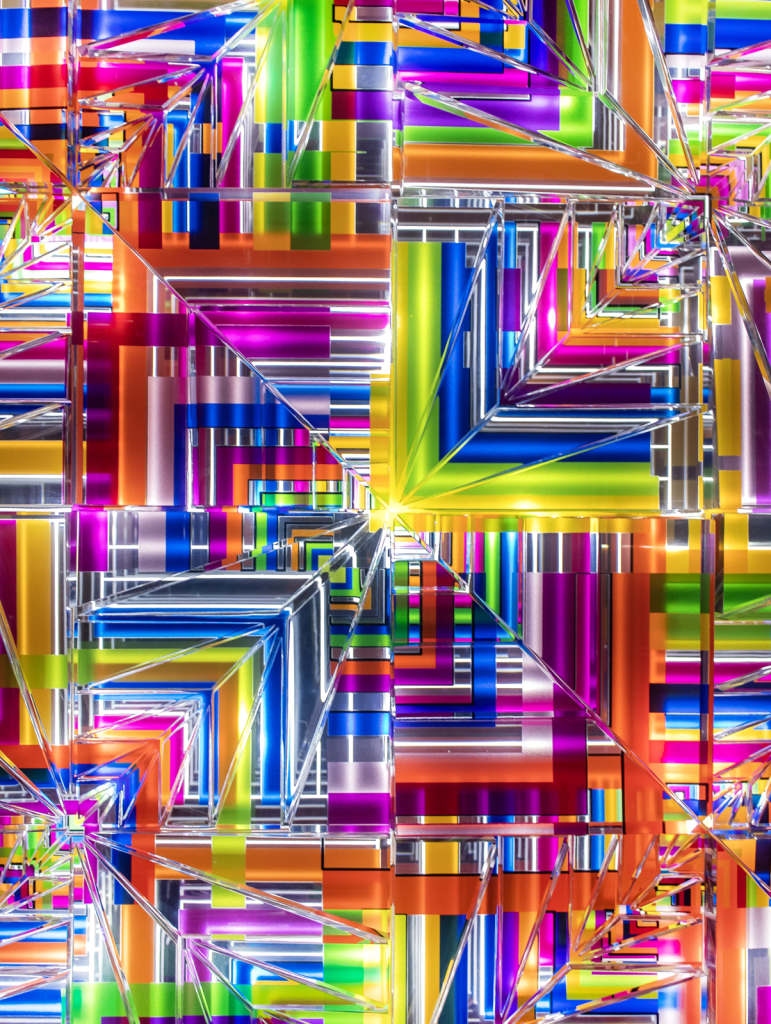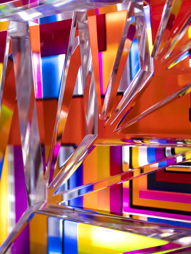 «Intersección Cromática» es una exploración visual de la convergencia de colores y formas en un espacio tridimensional, creando un paisaje cromático. La pieza representa una dimensión donde los colores se entrelazan y se fusionan visualmente. La transparencia del material permite que la luz juegue un papel fundamental, añadiendo profundidad y movimiento a la composición. Los bloques de plexiglás dispuestos sobre la superficie agregan otra dimensión a la obra, explorando nuevas perspectivas desde diferentes ángulos, actuando como puntos de encuentro entre los diversos elementos.