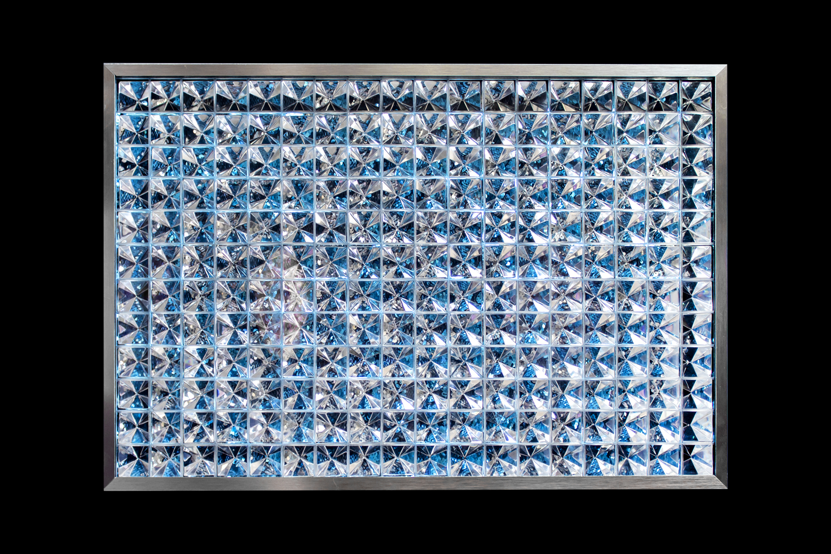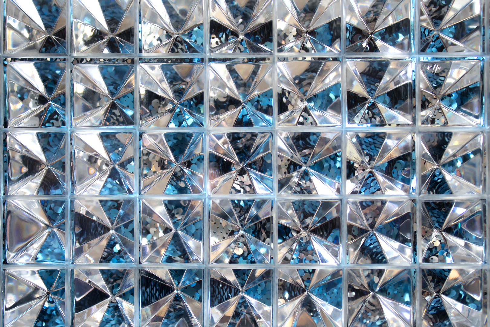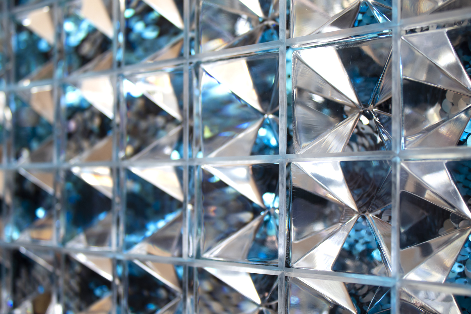 “Intersección Radiante” utiliza la geometría como agente de cambio en la percepción visual. A través de las formas invertidas, el uso de chaquiras y la luz reflejada en ellas, los vértices se convierten en puntos de transformación visual. Cada vértice refleja y refracta el entorno de manera única, fragmentando la realidad y ofreciendo nuevas perspectivas. La base coloreada amplifica esta interacción, añadiendo textura y profundidad, como si la luz encontrara una superficie viva.