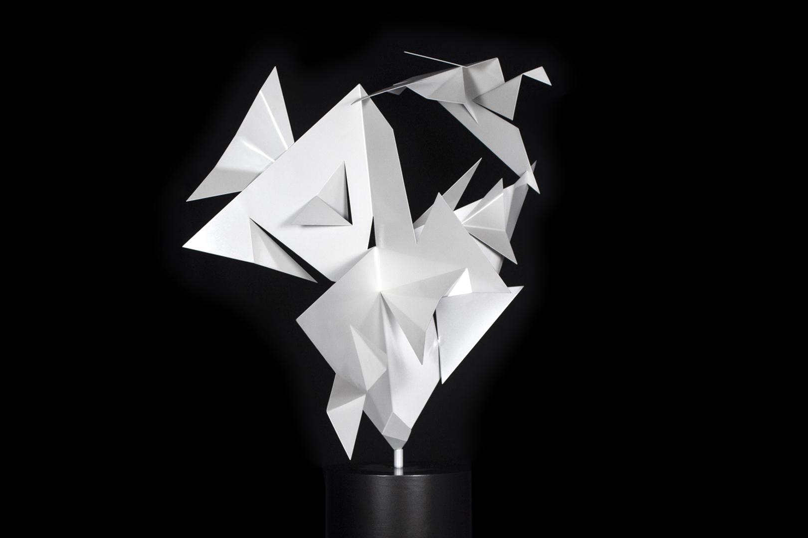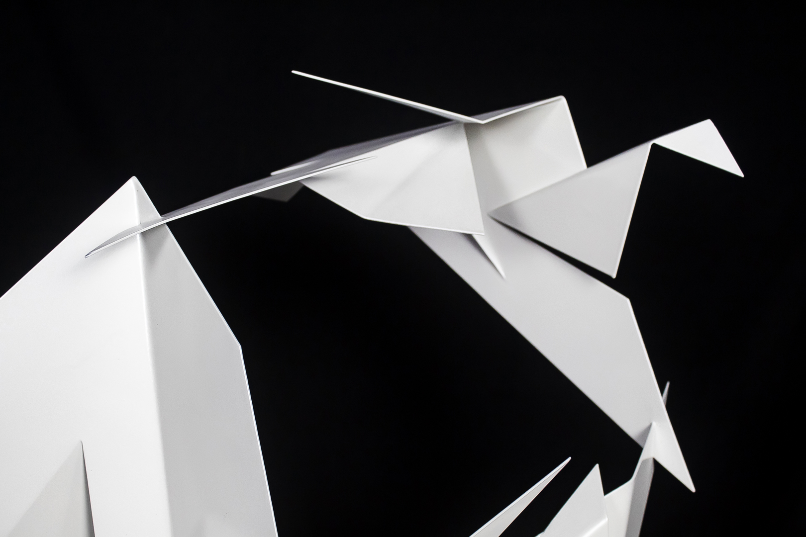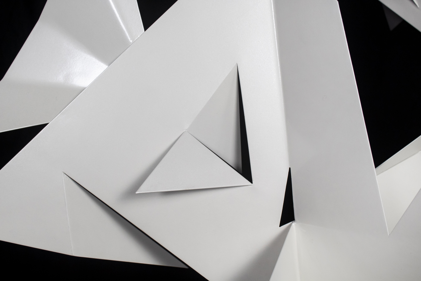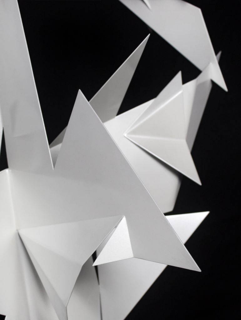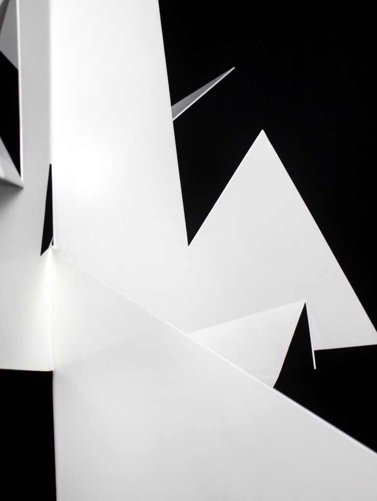 «Ocho veces así dos» continúa la exploración de las intersecciones entre orden y creatividad iniciada por su predecesora en la serie. En esta escultura, la repetición de formas geométricas en lámina de acero laqueado se torna más audaz, empleando variaciones sutiles que sugieren un ritmo y una progresión en la serie. La pieza refleja un avance en mi búsqueda personal por capturar la esencia de la claridad y la precisión en la expresión artística. Las líneas son más definidas y los ángulos más agudos, lo que contribuye a una percepción de movimiento y dinamismo, aun dentro de los confines de una  estructura rígida.