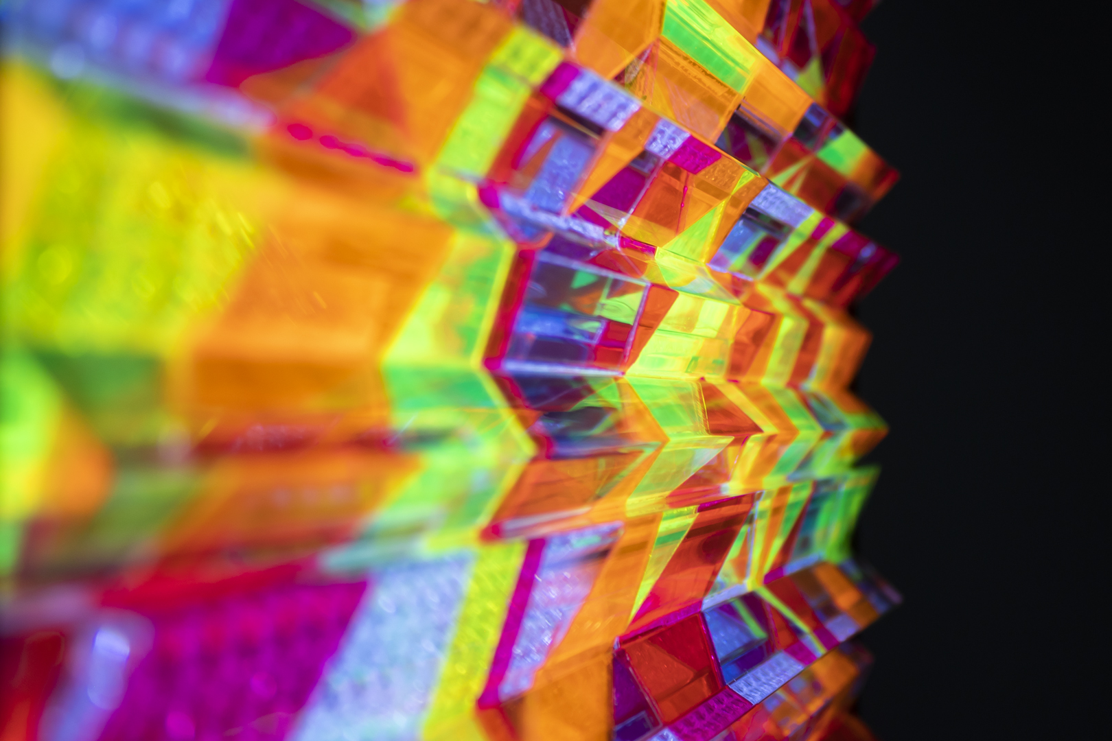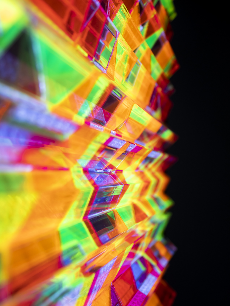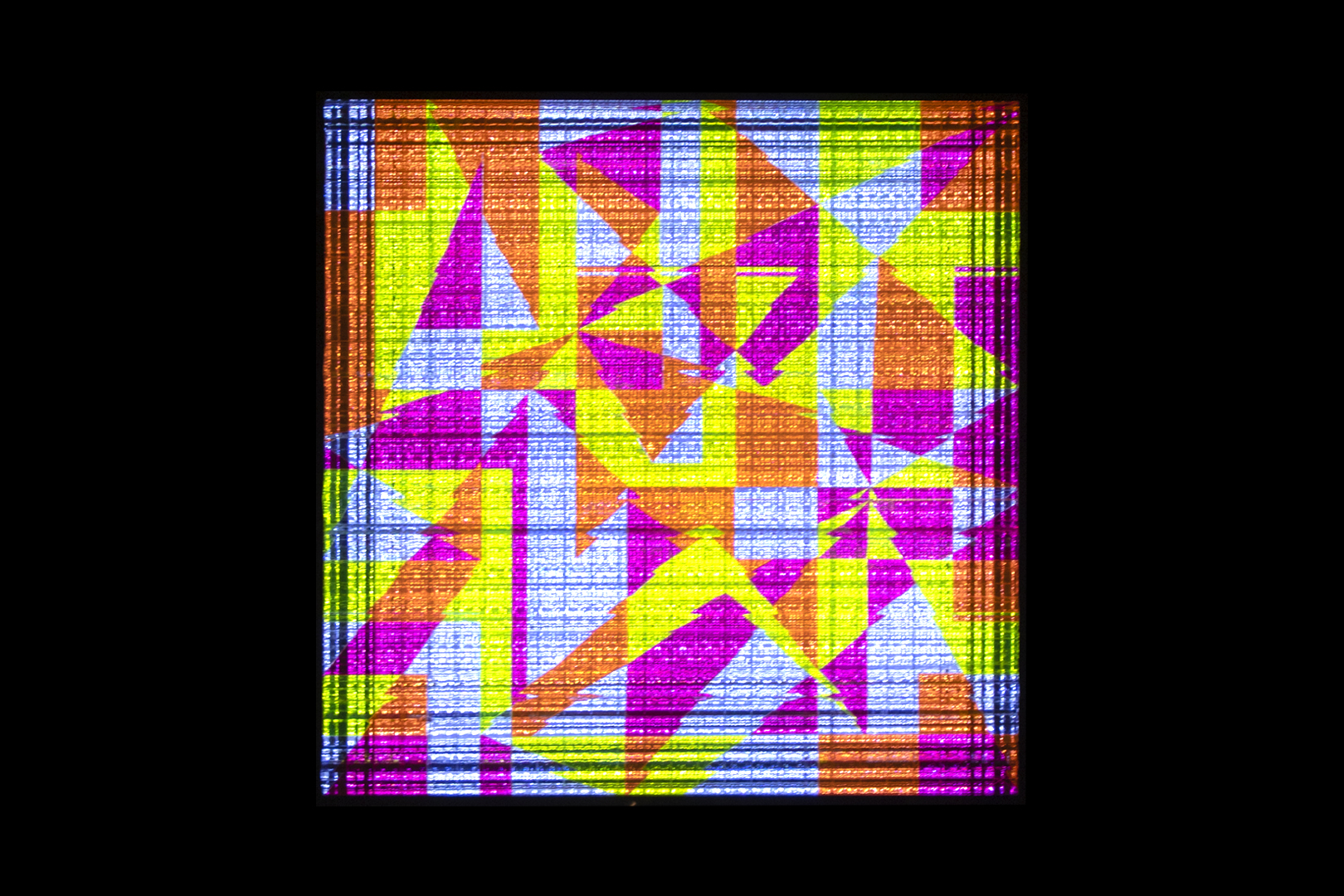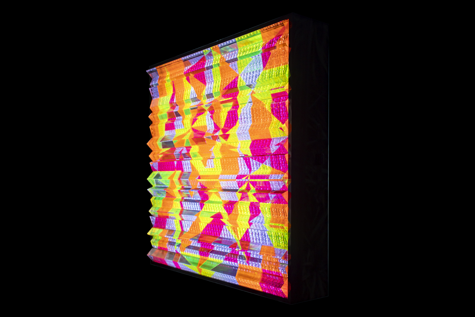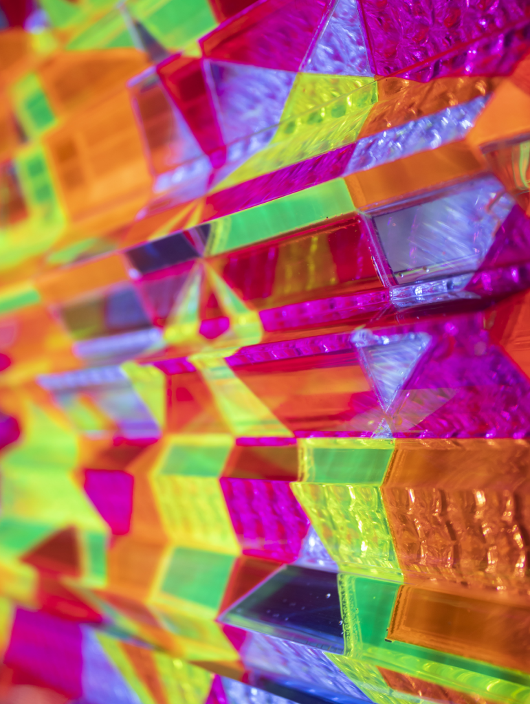 «Vibración Lumínica» es una obra que explora la interacción entre la luz, el movimiento y la geometría. En esta creación, utilizo una combinación de luces en movimiento para construir un espectáculo visual que evoca la energía y el dinamismo de la luz vibrante. El título refleja el concepto central de la obra: la percepción de la luz como una fuerza viva y oscilante que transforma y da vida a las formas geométricas. Las luces en movimiento no solo iluminan los patrones coloridos, sino que también generan una sensación de ritmo y flujo continuo, creando una experiencia visual que parece estar en constante evolución. La combinación de colores vibrantes junto con las formas triangulares, busca crear una sinfonía visual que captura la esencia de la luz en movimiento. La luz se convierte en protagonista, desplegando un ballet de reflejos y refracciones que se entrelazan en un flujo constante y armonioso.